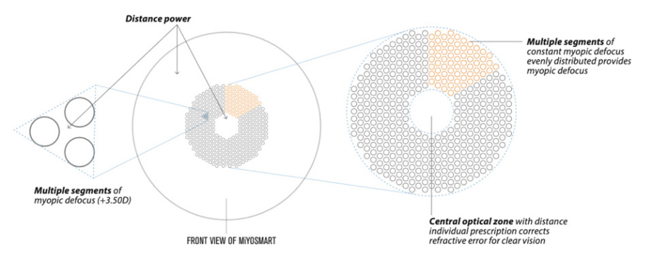 ● 先進科技:這些鏡片使用創新的光學區域或鏡片圖案,溫和地引導光線如何聚焦在視網膜上。 這有助於减少對眼睛的刺激,以延長眼睛的生長時間。